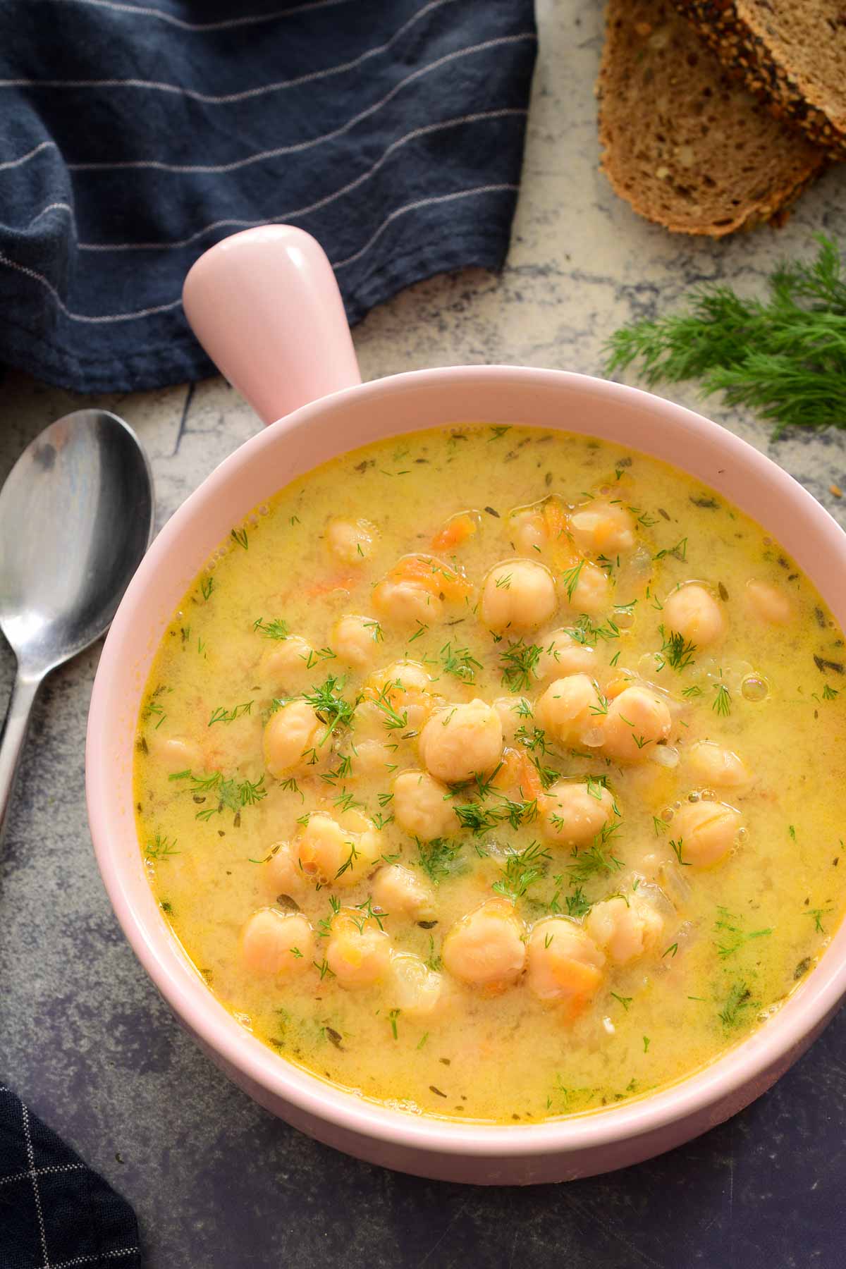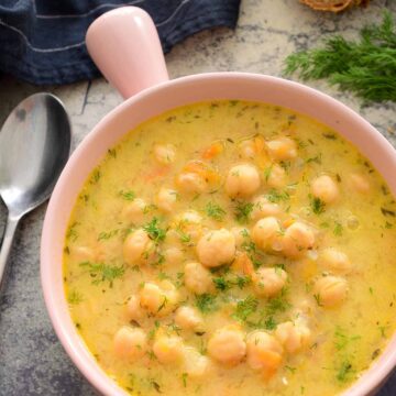 This Greek chickpea soup with lemon and herbs is cheap and easy to make. Packed with plant-based protein for a filling and hearty meal!